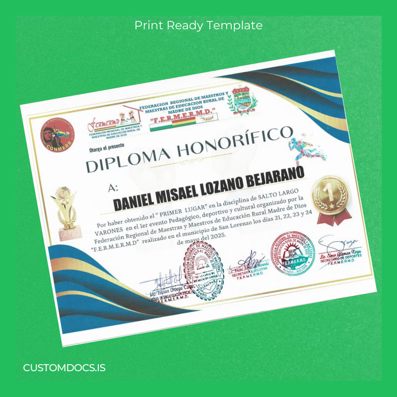 The Peru Federation of Teachers and Rural Education of Madre de Dios Honorary Diploma Template – Word & PDF offers an immediate, fully editable, and print-ready certificate solution designed to simplify your diploma replacement needs. Crafted for educators and professionals requiring rapid, authenticated-looking diplomas, this template ensures a hassle-free experience.