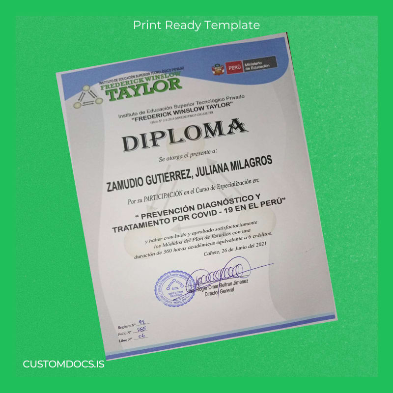 If you need a fast and reliable option, the Peru Frederick Winslow Taylor Institute Diploma in Prevention Diagnosis and Treatment for COVID-19 Template – Word & PDF provides an editable, high-quality solution for lost or replacement diplomas. Designed for quick customization, this template enables you to fill in all the necessary details with ease, saving time and avoiding administrative headaches.