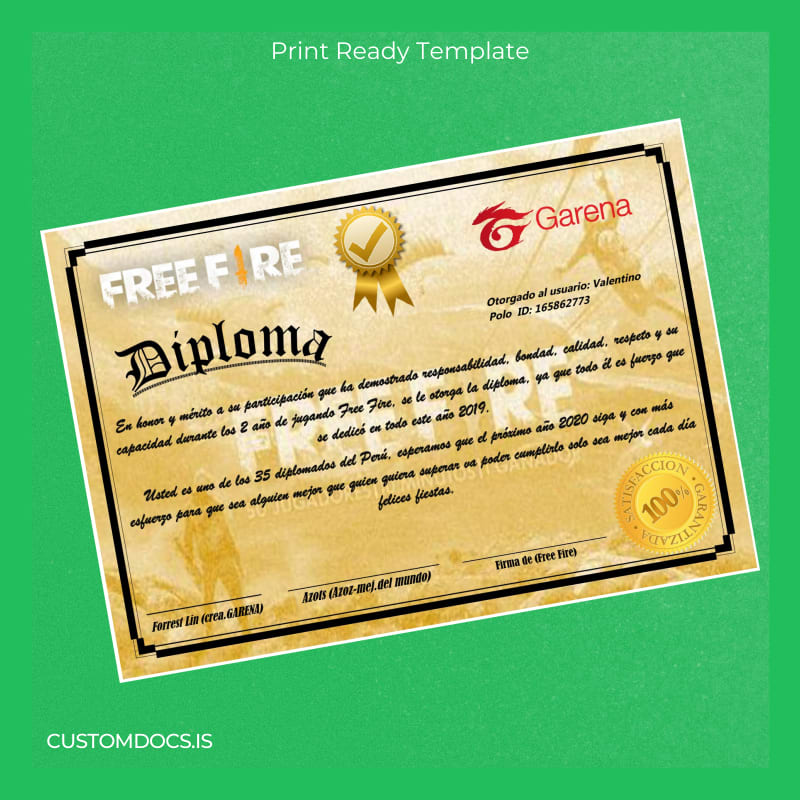 The Peru Free Fire Diploma Template – Word & PDF is your swift and customizable solution. Designed for professionals who require a reliable replacement diploma form without the lengthy official processes, this editable diploma template allows complete personalization of every detail. Whether you need to adjust names, dates, or other text elements, the intuitive Word and PDF formats make editing simple and accessible.