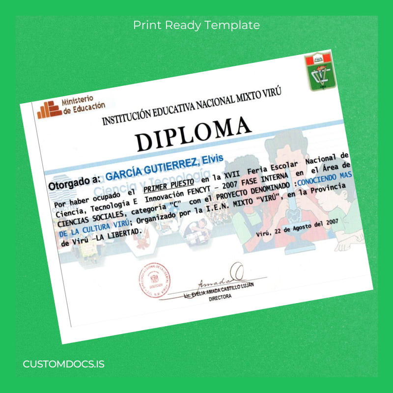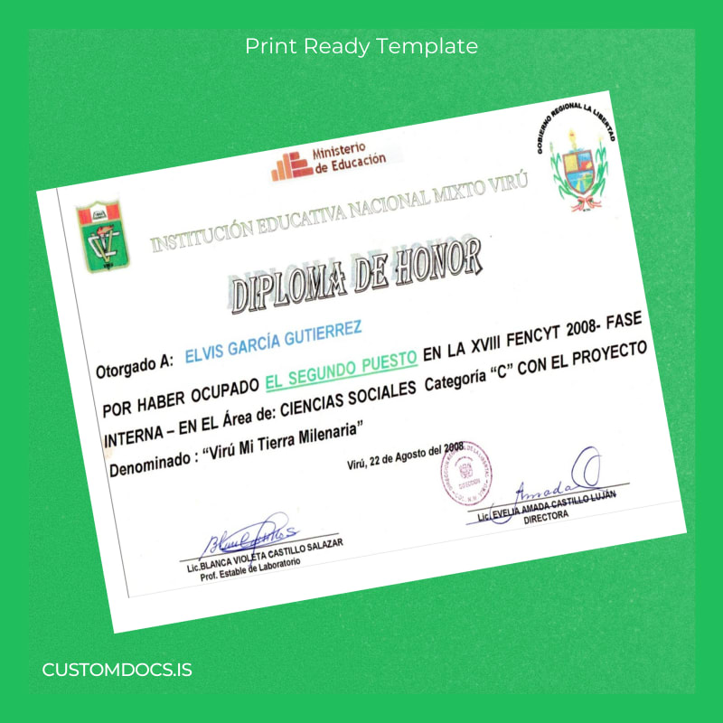 Download Peru Institución Educativa Nacional Mixto Virú Diploma Template – Word & PDF – Instant Digital File 3 Page