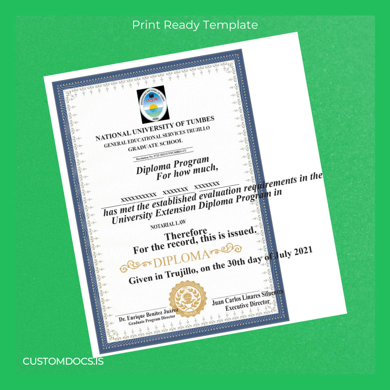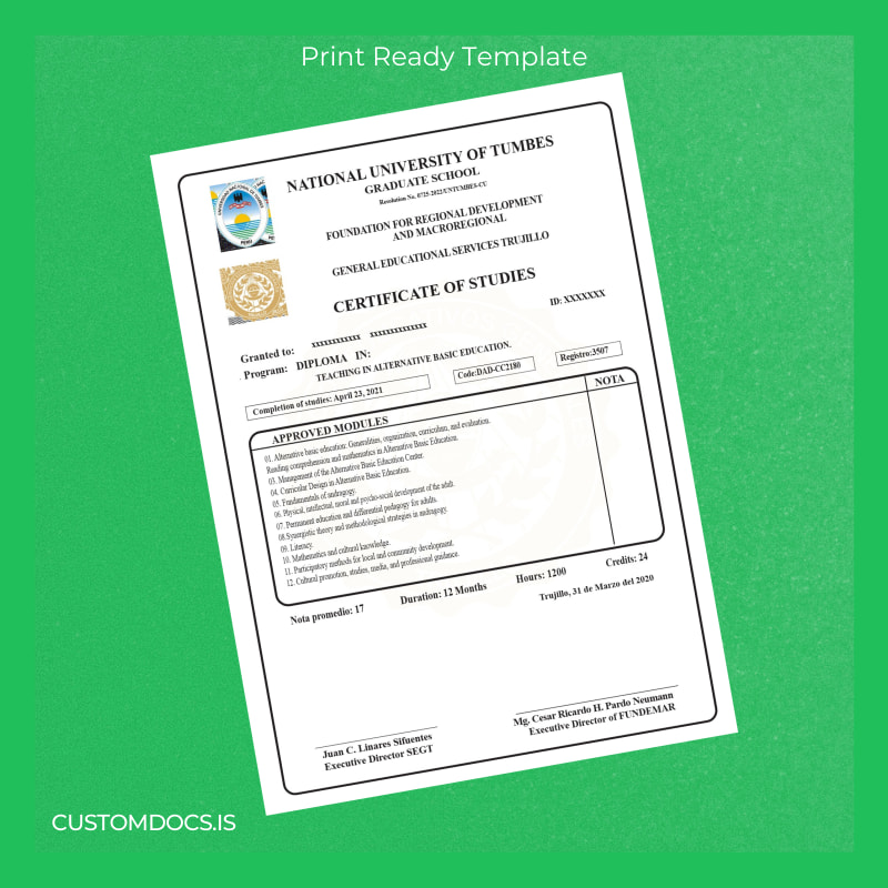 Our customizable degree template for the Peru National University of Tumbes Diploma in Teaching in Alternative Basic Education offers a fast, editable, and print-ready digital file in Word and PDF formats. This template is designed for educators, alumni, and administrative professionals who require an accurate and high-quality diploma replica without delay. Whether you need to replace a lost certificate, create a mockup for presentations, or simply keep a digital copy, this template fulfills those needs with precision and ease.