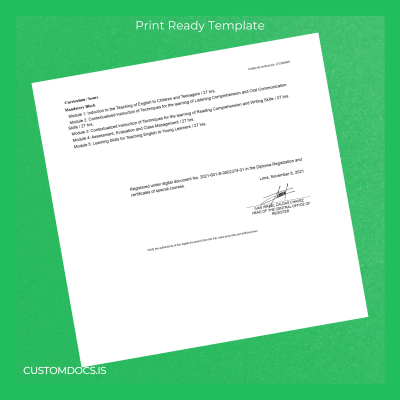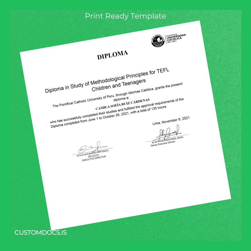 Fortunately, this customizable degree template from the Peru Pontifical Catholic University of Peru offers an instant, editable, and highly professional alternative. Designed specifically for the Study of Methodological Principles for TEFL Children and Teenagers qualification, the Word & PDF format allows for seamless personalization and immediate digital download.