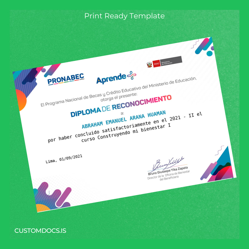 Available in versatile Word and PDF formats, this blank diploma form provides all the design elements you need, including high-resolution vector layers and included fonts, tailored to replicate the authentic PRONABEC recognition style. Professionals who require a replacement diploma quickly due to loss, theft, or expiration will appreciate the simplicity and speed of this editable diploma template.