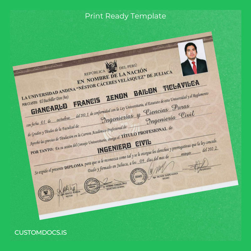 Losing important academic credentials like your Civil Engineering bachelor’s degree from Peru Universidad de Juliaca can be incredibly stressful. Waiting for official replacements may involve cumbersome bureaucratic procedures, extended delays, and possible missed professional opportunities. Time is critical when you need a valid, presentable certificate for job applications, further education, or verification purposes.
