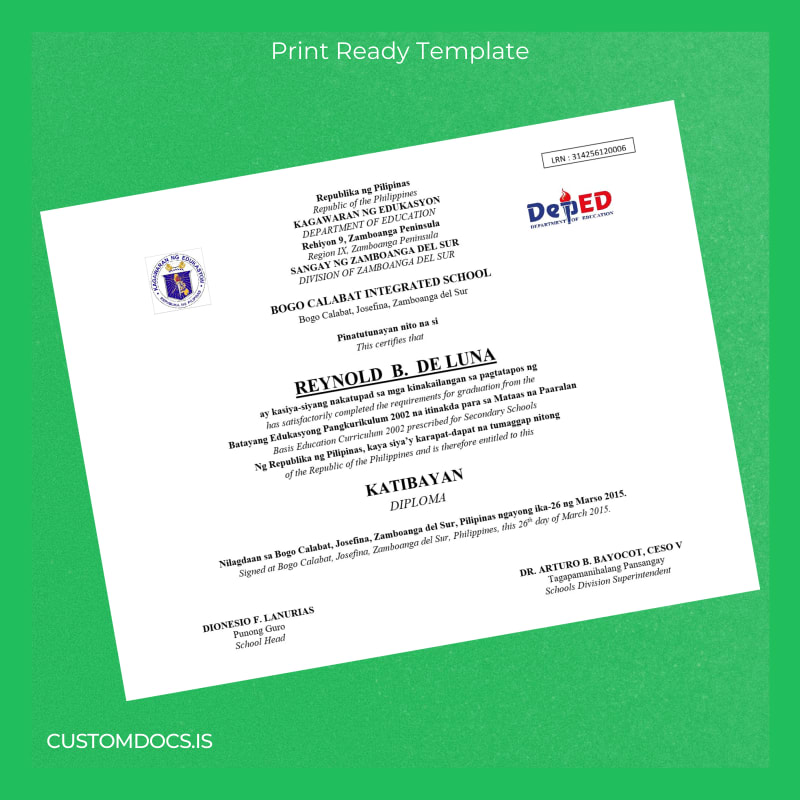 Download Philippines Bogo Calabat Integrated School High School Diploma Template – Instant Digital File 2 Page