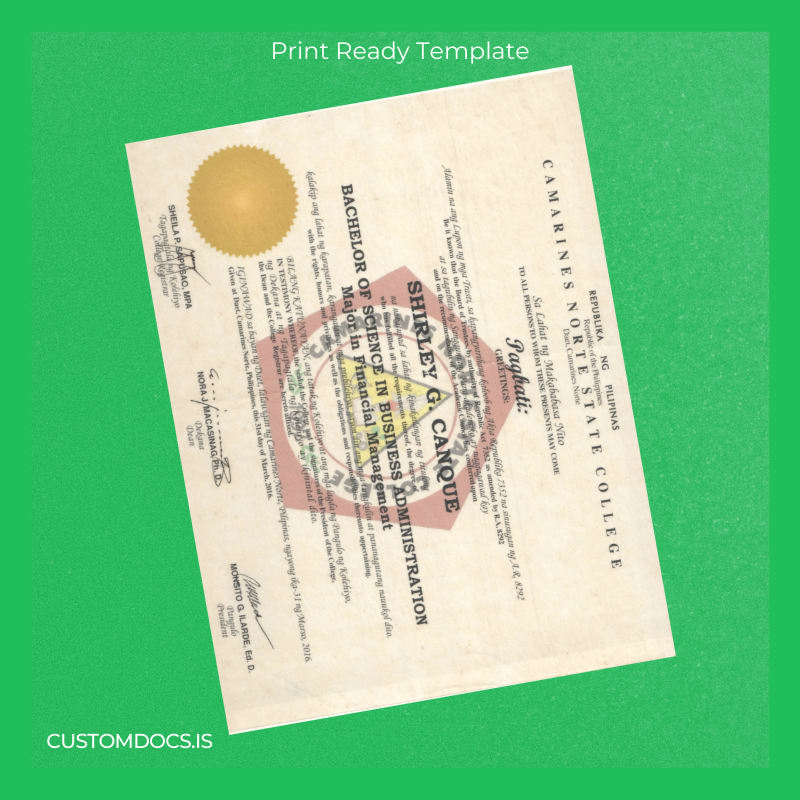 Introducing the Philippines Camarines Norte State College Bachelor of Science in Business Administration Template – Word & PDF, designed specifically for those who require a polished, editable diploma template ready for immediate customization and printing. This product serves as an ideal digital diploma solution for professionals needing a replacement or a clean, printable form that aligns perfectly with official academic records.