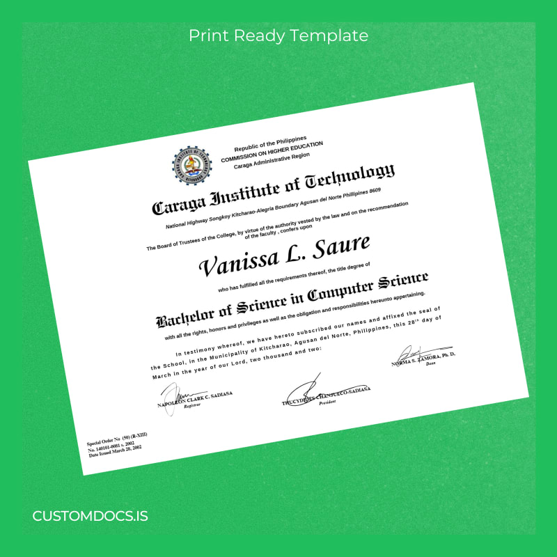 Designed for graduates and alumni who need a trustworthy replacement diploma template, this product addresses common pain points such as document loss, damage, or the need for a duplicate at short notice. Utilizing this blank diploma form eliminates uncertainty and provides peace of mind with a legally styled certificate modeled on the official Caraga Institute format. Regain control over your credentials with this novelty diploma design that combines authenticity and convenience.