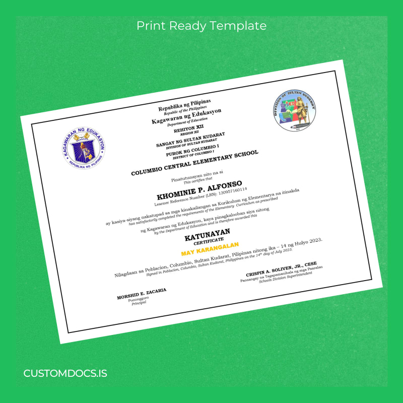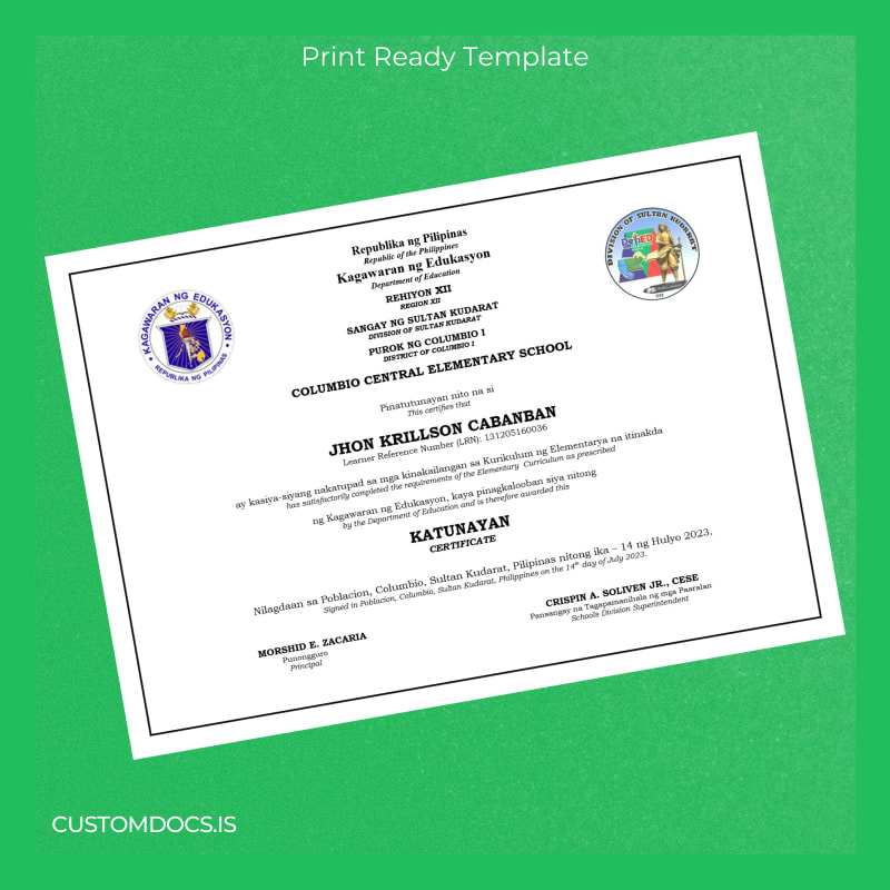 Avoid the hassle and frustration associated with traditional document replacements by choosing the Philippines Columbio Central Elementary School Elementary Completion Certificate Template – Word & PDF. This editable diploma template provides a fast, reliable, and professional solution, empowering users to customize and print their own certificates without extensive wait periods.