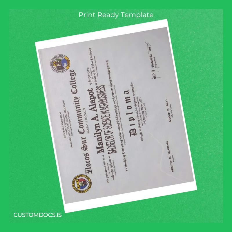 Instant Editable Diploma Template for Philippines Iloos Sur Community College Graduates