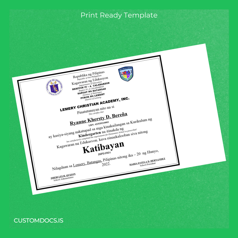 Get the Philippines Lemery Christian Academy Inc Kindergarten Diploma Template – Word & PDF now and enjoy peace of mind knowing your diploma replacement is professional, customizable, and immediately accessible.