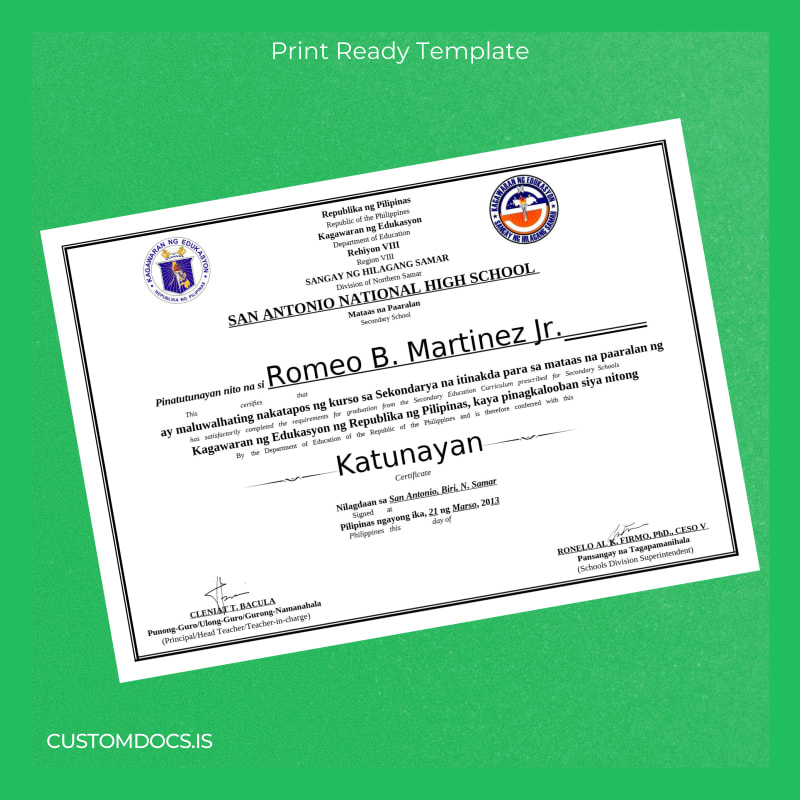 Download Philippines San Antonio National High School High School Diploma Template – Word & PDF – Instant Digital File 2 Page