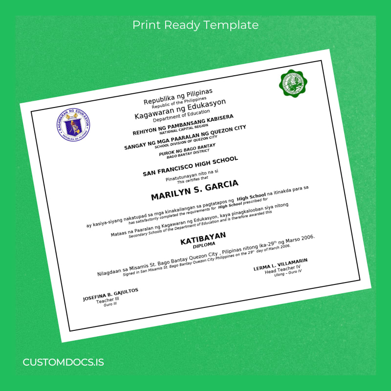 The Philippines San Francisco High School High School Diploma Template – Word & PDF offers a fast, reliable way to restore your academic credentials with professional finesse. Designed for educators, administrative staff, and graduates, this customizable degree template provides an editable and print-ready format that can be tailored to your specific requirements. Avoid delays and move forward confidently by employing this easy-to-use customizable degree template crafted specifically to meet formal diploma standards.