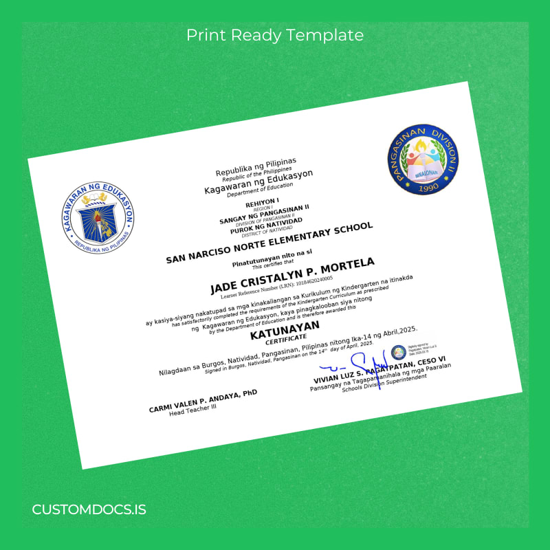 Download Philippines San Narciso Norte Elementary School Kindergarten Diploma Template – Word & PDF – Instant Digital File 8 Page