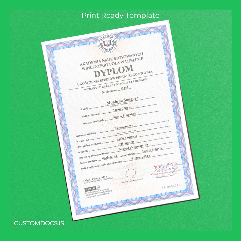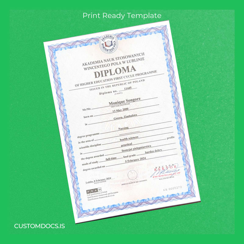 Editable and customizable Poland Akademia Nauk Stosowanych Wincetego Pola w Lublinie Bachelor of Science in Nursing Template – Word & PDF for instant diploma replacement.