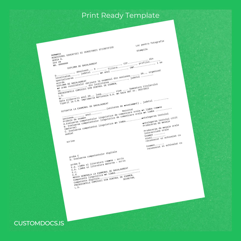 This template suits professionals, students, and anyone needing a fast, reliable solution for a lost or expired Romania Bacalaureat Diploma. Avoid bureaucratic frustration and missed deadlines by utilizing an editable, customizable degree template designed to provide instant digital access and effortless personalization.