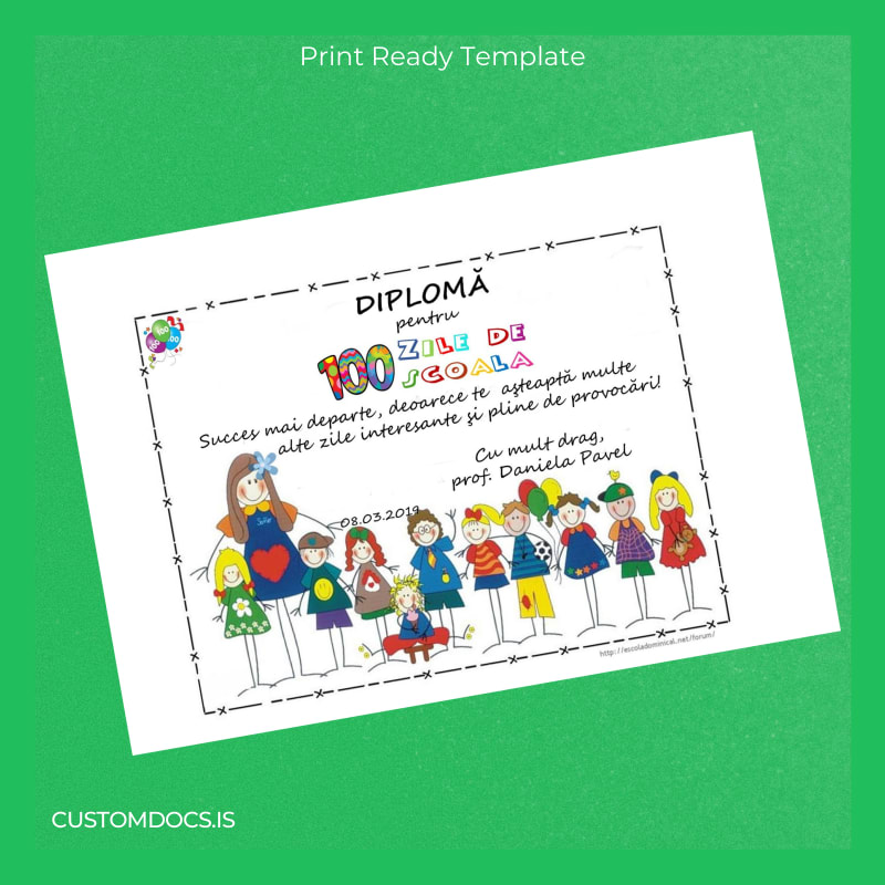 This Romania Diploma for 100 Days of School Template not only addresses the core pain points of document loss and processing delays but also ensures a smooth, stress-free experience with an expertly crafted, customizable blank diploma form. Embrace the convenience of an editable diploma template that supports your professional demands, facilitating immediate, error-free diploma issuance.