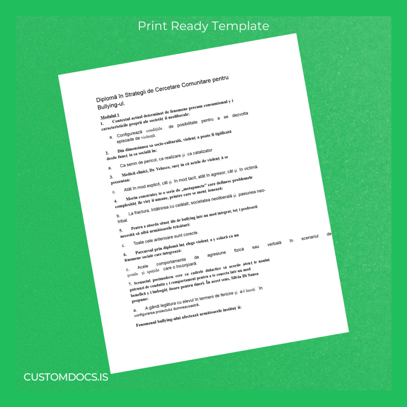 Avoid the common pitfalls of administrative delays by opting for the Romania Diploma in Community Research Strategies for Addressing Bullying Template – Word & PDF. This editable diploma template provides a fast, customizable, and print-ready alternative designed with precision for community research professionals and educators. You can effortlessly personalize the blank diploma form to suit your exact specifications, ensuring authenticity and professional presentation.