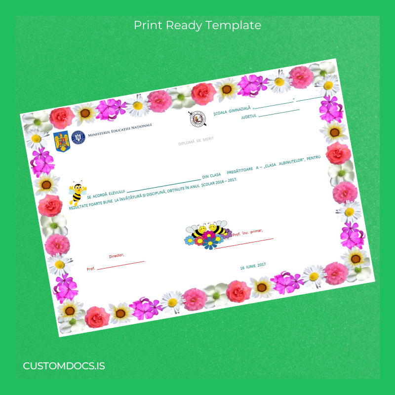 Our customizable degree template for the Romania School Certificate of Merit for Preparatory Class A 2016-2017 provides the perfect instant remedy. Designed for ease of use and professional presentation, this editable diploma template comes ready in both Word and PDF formats, allowing you to personalize every detail rapidly without any advanced technical skills. Whether you need a replacement diploma template or a blank diploma form for verification purposes, this novel digital diploma download offers unmatched convenience.