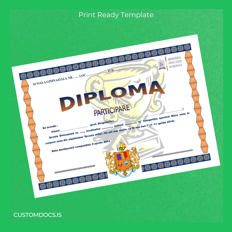 Introducing the Romania School Diploma Participation Template – Word & PDF, a fully editable and customizable digital diploma designed for quick turnaround and professional results. Perfect for educators, institutions, or individuals requiring a precise and trustworthy document replica, this template provides an immediate solution accessible from your device. Edit all essential details with ease and prepare a polished diploma ready for printing or digital use.
