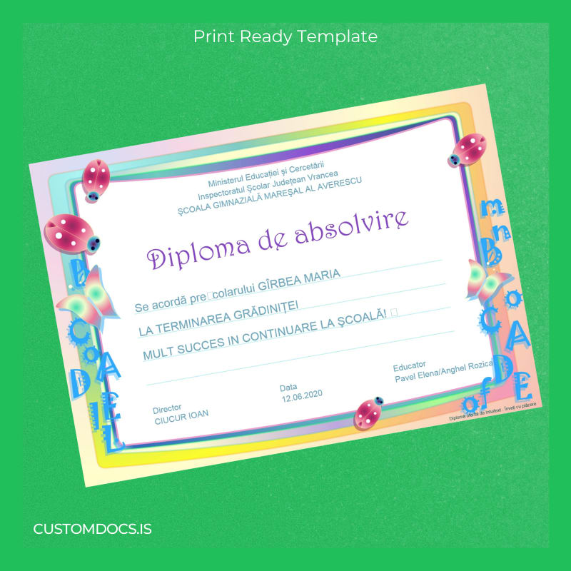 Don’t let these challenges slow you down. The Romania School Gymnasium Maresal Averescu Kindergarten Completion Diploma Template – Word & PDF offers a hassle-free, fully editable solution to quickly restore your essential credentials. This customizable diploma template is designed for seamless editing, allowing you to personalize all document details such as name, date, and institution information. The template comes in both Word and PDF formats, enabling easy compatibility and user-friendly modifications.