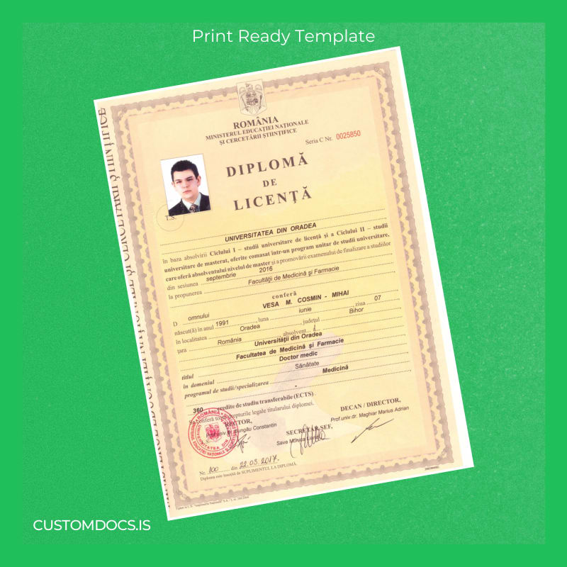 Losing an important document like a medical degree can cause immense stress and disrupt professional progress. The tedious bureaucratic processes, long waiting periods, and potential missed job opportunities only add to the anxiety. Now, you can bypass these challenges with the Romania University of Oradea Doctor of Medicine Template – Word & PDF, designed to provide a fast, editable, and professional replacement.