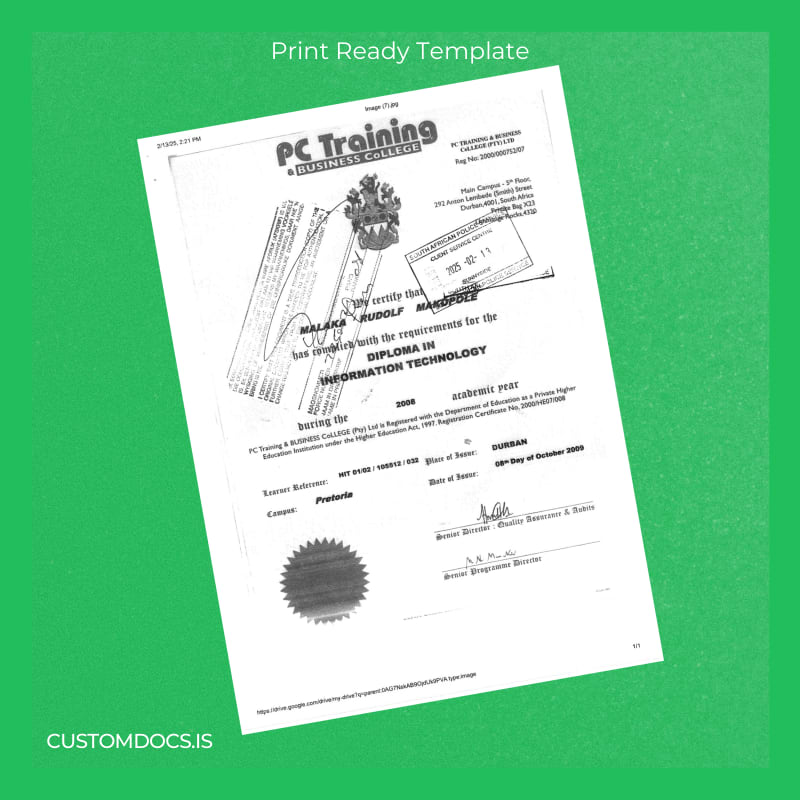 Download South Africa PC Training and Business College Diploma in IT Template – Instant Digital File