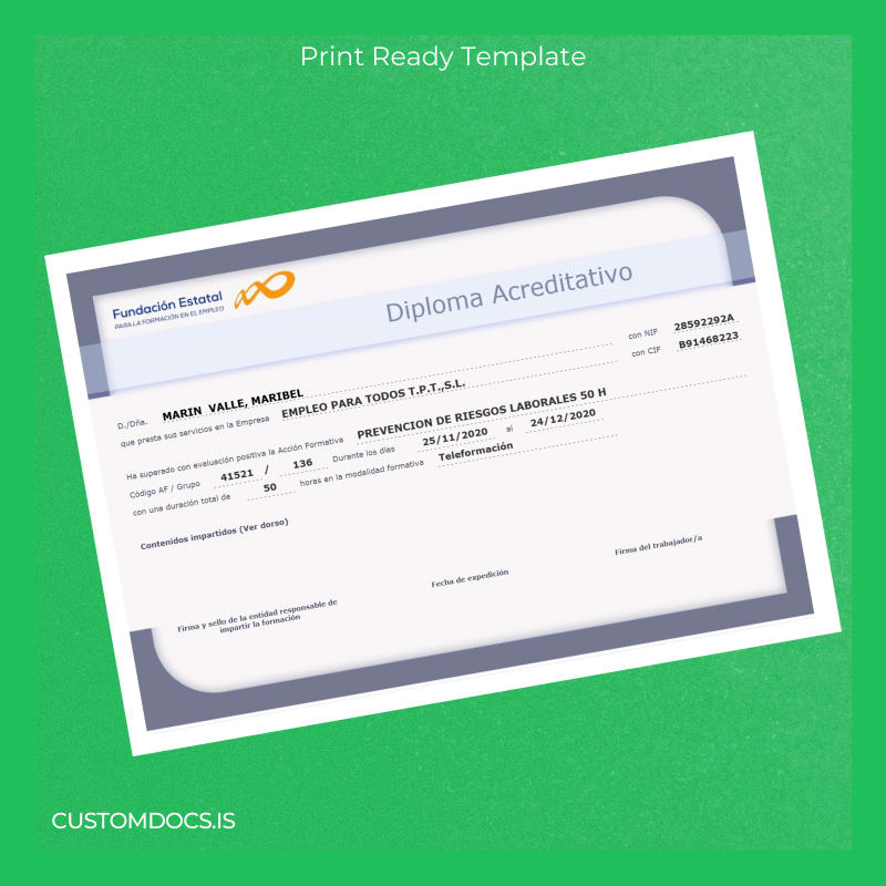 Eliminate these concerns with the Spain Employment for All S.L. Diploma in Occupational Risk Prevention 50 Hours Certificate Template – Word & PDF, designed as an instantly editable and customizable diploma template. This digital diploma download ensures you regain control of your professional documentation without delay.