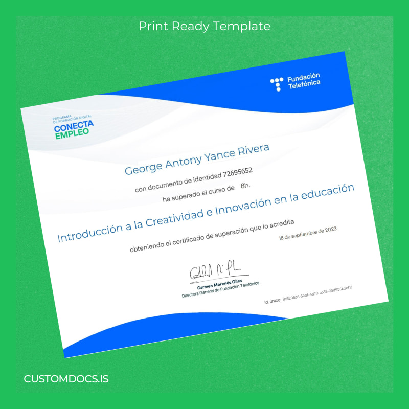Designed specifically for educators, administrators, and professionals requiring certified documentation, the Spain Fundación Telefónica Introduction to Creativity and Innovation in Education Certificate Template – Word & PDF offers an editable and fully customizable solution. This template is your efficient alternative to lengthy processing times, enabling instant digital download and rapid personalization to suit your unique needs.