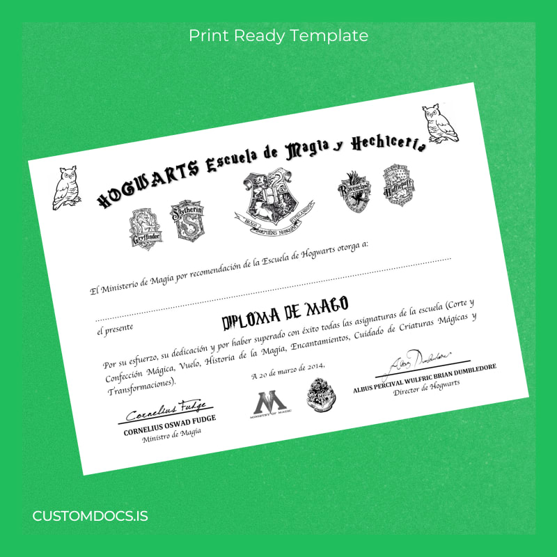 Meet the Spain Hogwarts School of Magic and Wizardry Wizard Diploma Template – Word & PDF, the perfect digital diploma download designed for those who need a fast and flexible replacement or novelty diploma design. This template belongs to the exclusive customizable degree template category, ensuring professional quality combined with ease of use to settle your document emergencies effortlessly.