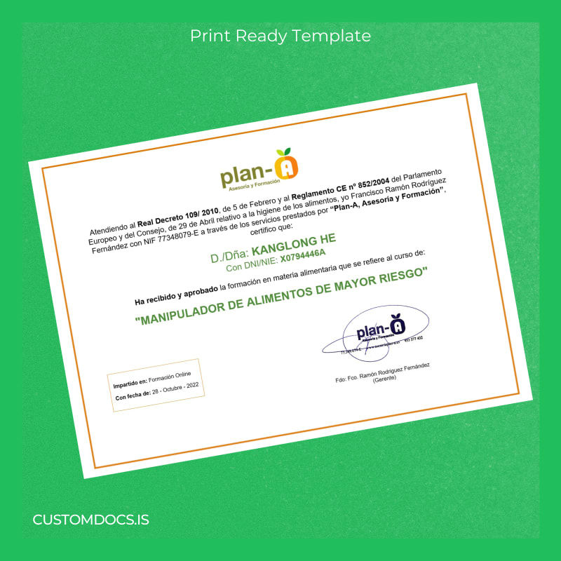 The Spain Plan-A Food Handler Certificate Template – Word & PDF offers a seamless way to create a professional food handler certificate instantly. This digital diploma download features a novel design tailored for Spain’s food handling requirements and is fully customizable in both Word and PDF formats. Easily adjust all document details, including name, date, and certification specifics, ensuring a perfect fit for your needs. This template is an essential resource for those who need a fast replacement diploma without compromising quality.