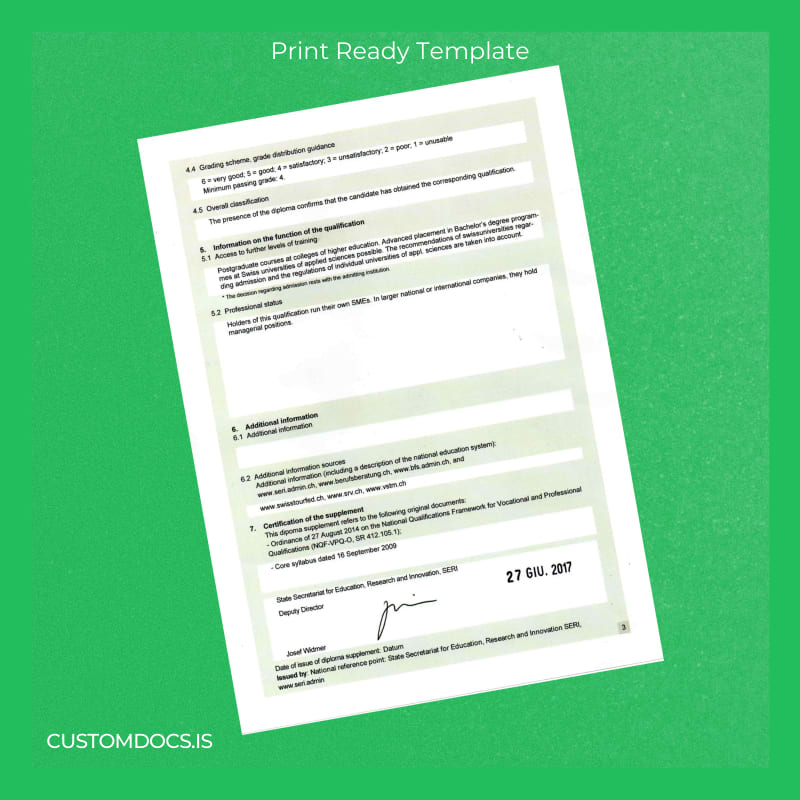 This template is ideal for graduates, educators, and HR professionals who require a trustworthy replacement diploma quickly. Whether you lost your original, had it stolen, or need a backup copy for verification, the Switzerland Diploma 3 Template offers a seamless, legally inconsequential alternative for personal and professional use.