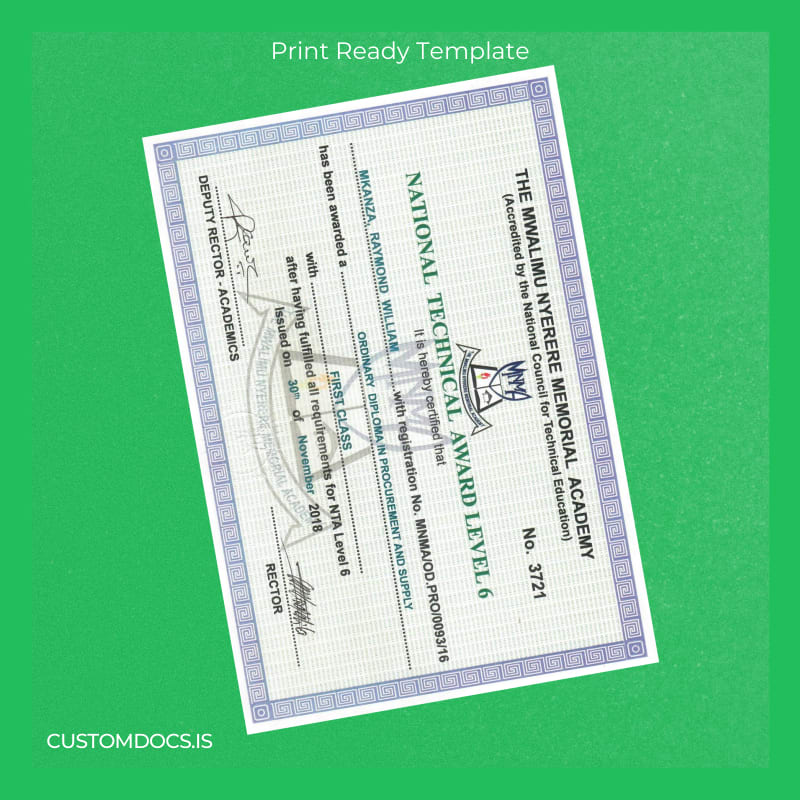 Don’t let missing documents hold you back. Access our customizable degree template designed specifically for the Tanzania Mwalimu Nyerere Memorial Academy Ordinary Diploma in Procurement and Supply. This editable and print-ready Word and PDF template offers an instant solution to obtain a professional-quality diploma without the typical wait.