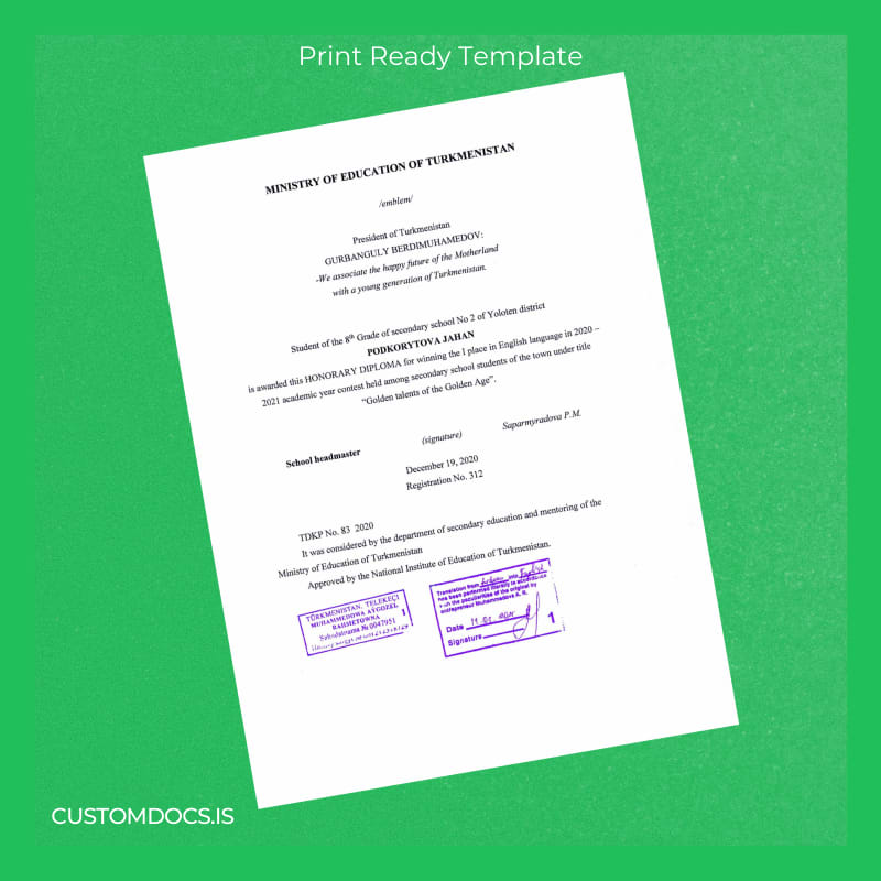 • Designed specifically for honorary diplomas issued by Turkmenistan institutions.
