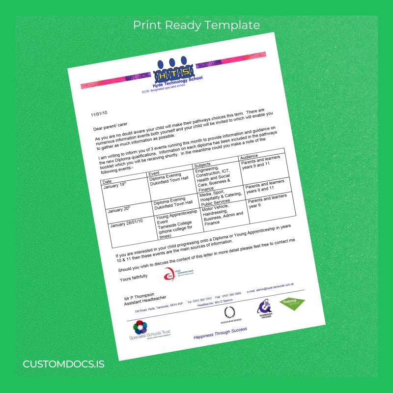 Download UK Hyde Technology School Diploma Letter Template – Word & PDF – Instant Digital File 2 Page