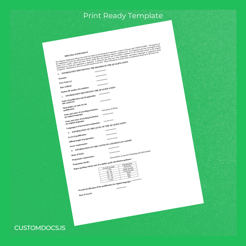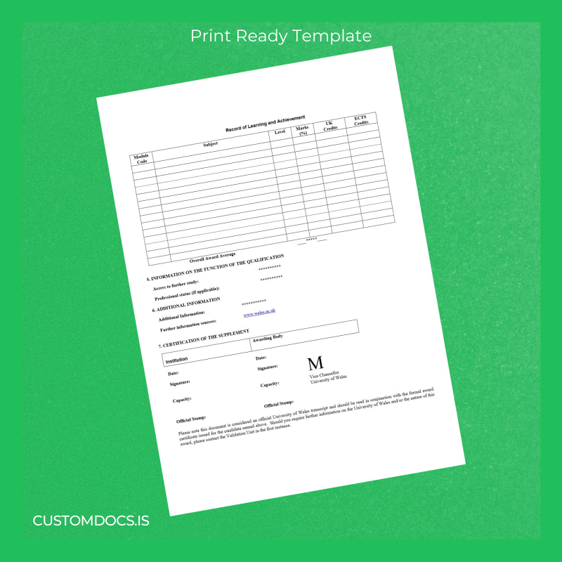- Includes detailed formatting and design elements mirroring the official UK University of Wales diploma supplement look and feel.
