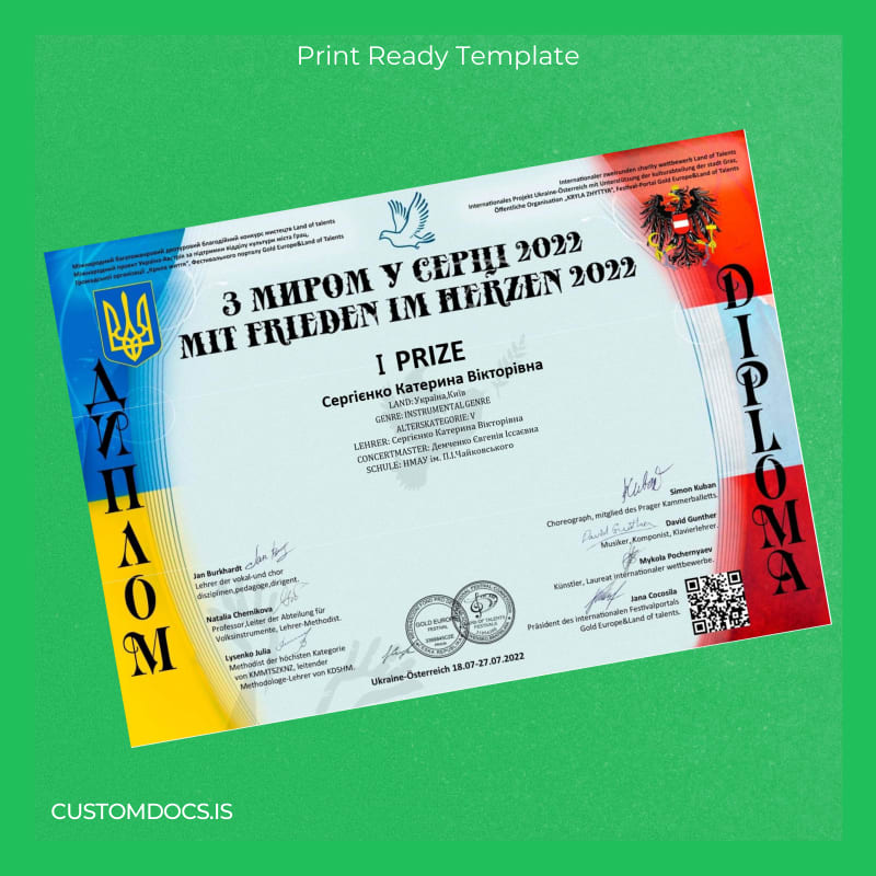 The Ukraine International Center First Prize Diploma Template – Word & PDF provides a swift, customizable alternative for those needing a polished diploma design quickly. This professionally crafted template allows immediate access and editing to replicate your diploma accurately. It’s perfect for professionals who require a high-quality diploma replacement without waiting weeks for official documents. Whether you need to update details such as names, dates, or degree information, this template offers full flexibility.
