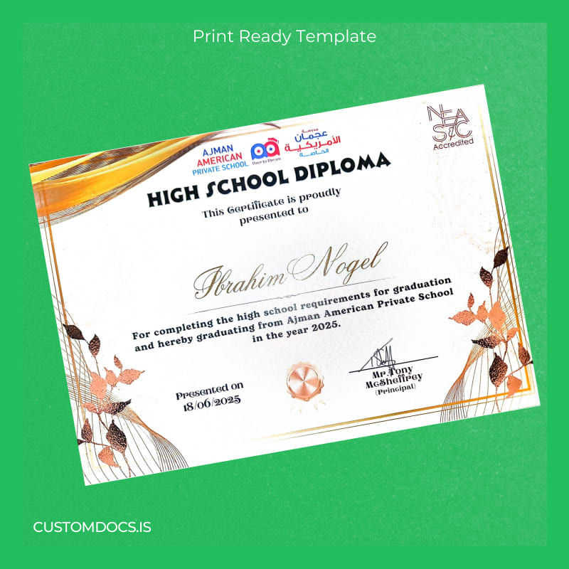 The United Arab Emirates Ajman American Private School High School Diploma Template – Word & PDF offers a fast, editable, and print-ready option that saves you time and stress. Designed for professionals needing immediate access, this template allows you to customize every detail from your name to graduation date seamlessly.