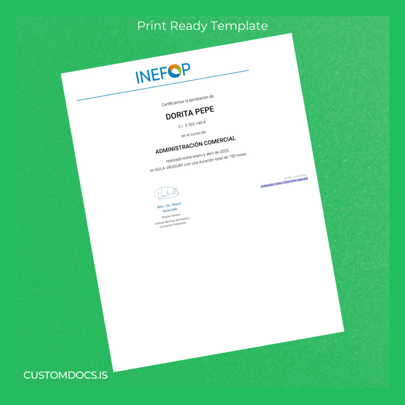 The Uruguay Instituto Nacional de Empleo y Formación Profesional Diploma in Commercial Administration Template – Word & PDF is a fully editable and print-ready document designed to meet your immediate needs. Easily customize all essential details such as your name, date, and institution specifics with user-friendly Word and PDF formats.