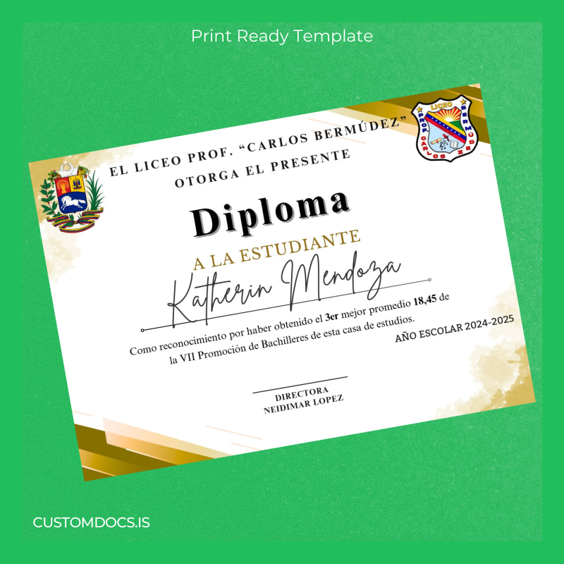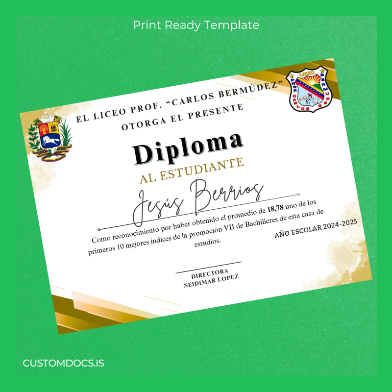 Download the Venezuela Prof. Carlos Bermúdez High School Diploma Template – Word & PDF Today