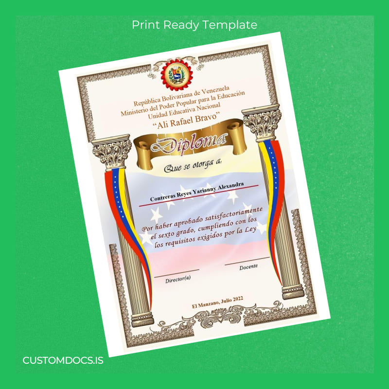 The Venezuela Unidad Educativa Nacional ‘Ali Rafael Bravo’ Diploma Template – Word & PDF offers an immediate and fully editable digital solution. Designed specifically for quick customization, this template lets you update all necessary details easily and print a professional-grade diploma without waiting.