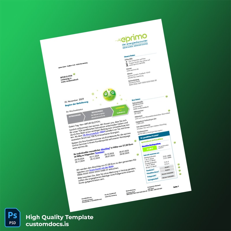 Germany Eprimo GmbH Editable Utility Bill Template in Word and PDF Formats