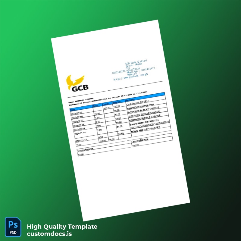 Don’t let document setbacks hinder your progress. Embrace the convenience and reliability of our Ghana GCB Bank Statement Template, empowering your professional journey with hassle-free documentation. Secure your template today and restore your peace of mind—it’s just a few clicks away. For more robust options, check out related bank statement solutions and enhance your professional portfolio.