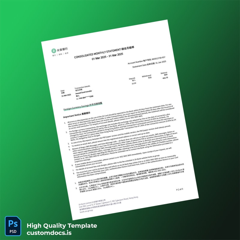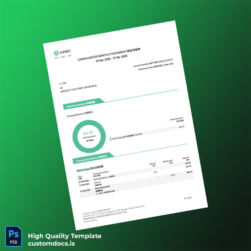 Hong Kong ZA Bank Statement Template in Word and PDF Formats
