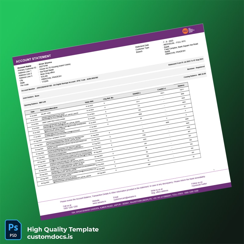The India AU Bank Statement Template is your perfect solution for quickly creating professional-grade bank statements in both Word and PDF formats. Designed for professionals who require accurate and editable bank statements for various purposes—be it for personal finance management, loan applications, or record keeping—this template saves you time and effort while enhancing your credibility.