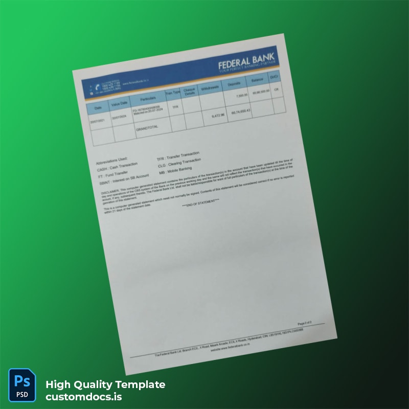 India Federal Bank Bank Statement Template in Word and PDF Formats