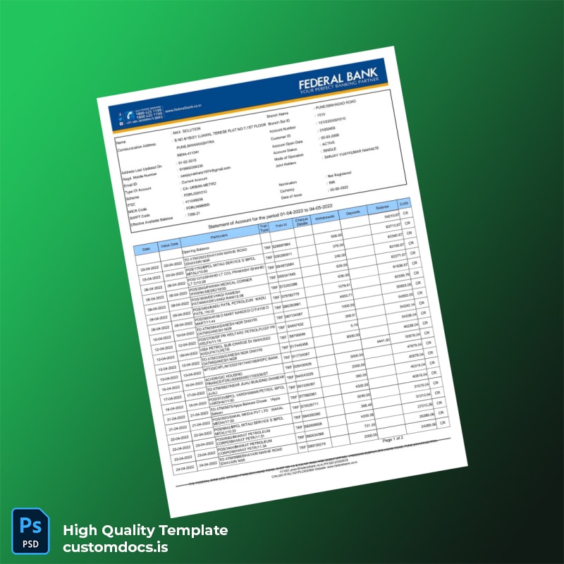 Be the first to review “India Federal Bank Statement Template in Word and PDF formats 2 page”
