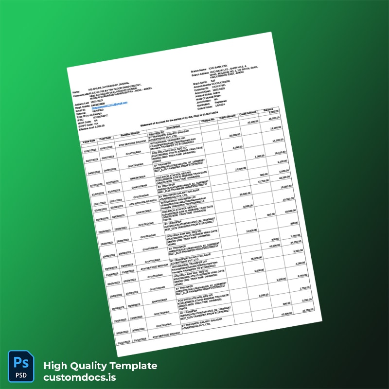India ICICI Bank Account Statement Template in Word and PDF Formats