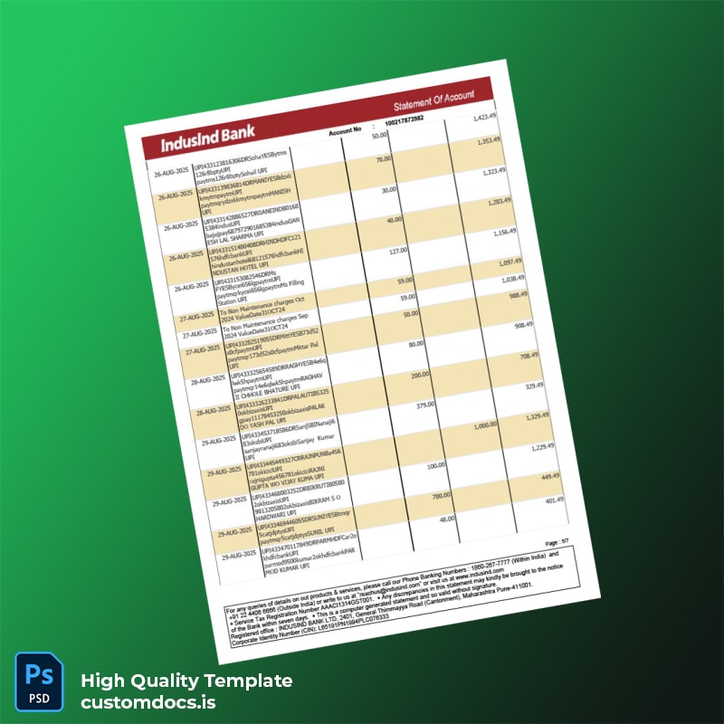 India IndusInd Bank Statement Template in Word and PDF Formats