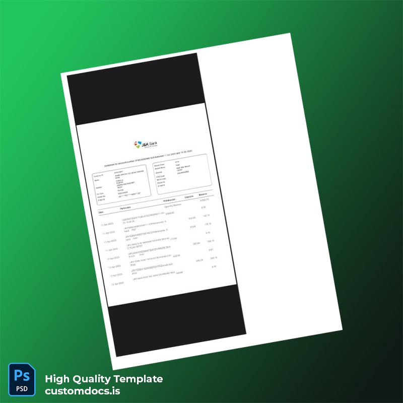 Imagine a busy executive named Priya, who needed a replacement bank statement after losing her original one just days before a major loan application. Time was of the essence. With the India J K Bank Statement Template in Word and PDF formats, she quickly customized it by filling in her name, transaction history, and other relevant details, allowing her to present a professional and accurate statement to the bank within minutes.