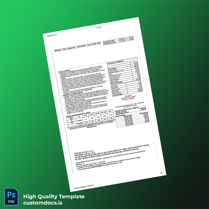India Maharashtra State Electricity Distribution Co Ltd Editable Utility Bill Template Overview